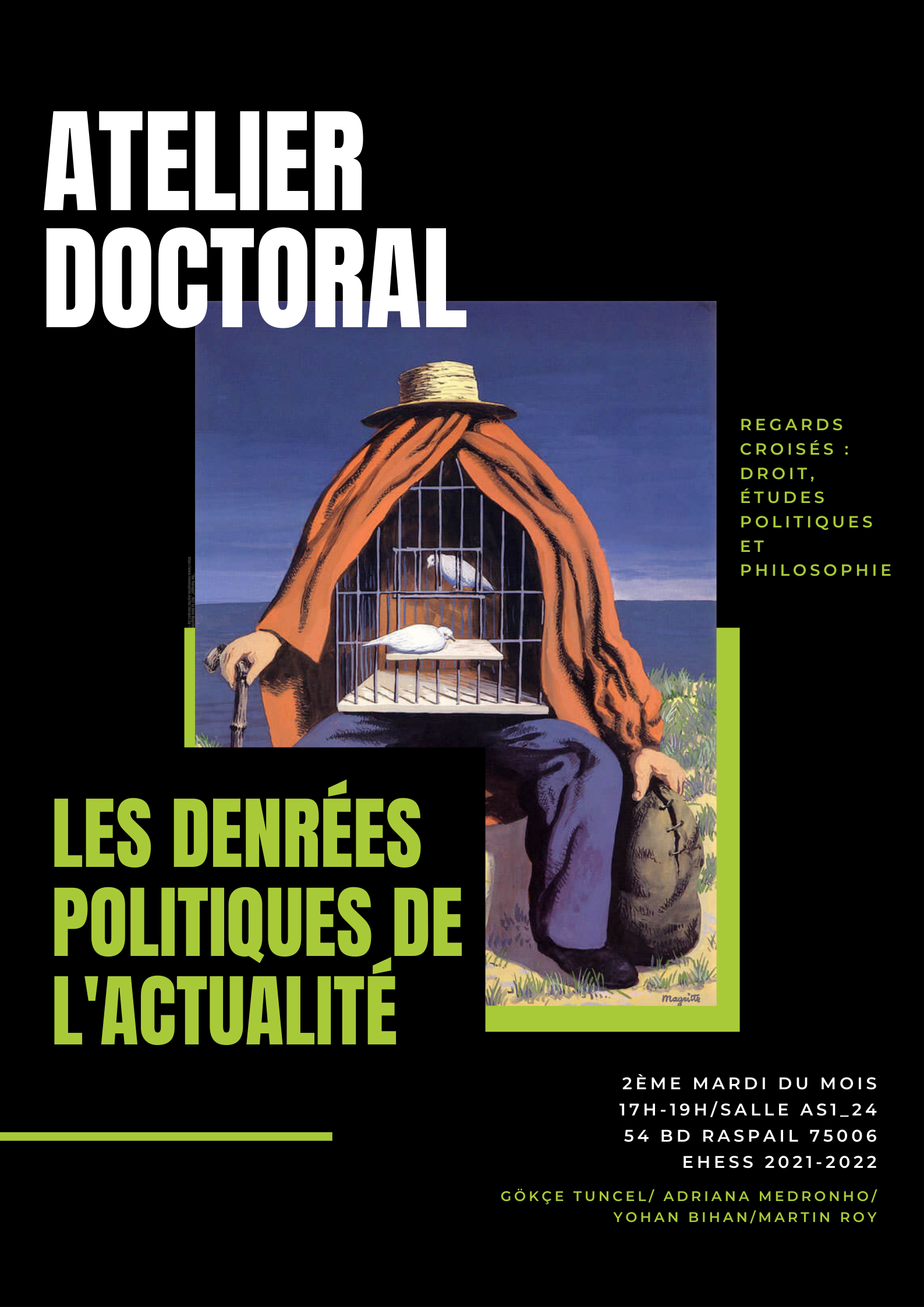La proposition de cet Atelier de doctorant·e·s est née d’une volonté manifeste des collègues inscrit·e·s aux Formation doctorales de l’EHESS « Droit, Études politiques, Philosophie » et « Sociologie ». Travaillant tou·tes sur le politique en ses diverses formes et approches disciplinaires, nous avons voulu construire un espace débats qui nous permettrait de saisir et discuter de la turbulente actualité politique de ces dernières années, lors d’un rendez-vous régulier où nous pourrions croiser les regards disciplinaires dans l’analyse des phénomènes qui nous intéressent et qui traversent nos sujets de recherche. De surcroît, nous avons voulu que 2021-2022 soit également une année de reprise de nos activités collectives en présentiel, fait qui donnerai l’occasion aux primos-arrivant·e·s des années de pandémie d’avoir un espace où se rencontrer entre collègues, toutes formations doctorales confondues. C’est pourquoi il nous a paru important que les séances de l’Atelier soient également des moments conviviaux où l’on discute de nos recherches, nos difficultés, nos intérêts professionnels. L’idée centrale de cet atelier a été ainsi de proposer un rendez-vous fixe entre les doctorant·es souhaitant profiter d’un espace ouvert fait par et pour les doctorant·es de toutes les mentions de l’École doctorale 286 de l’EHESS.